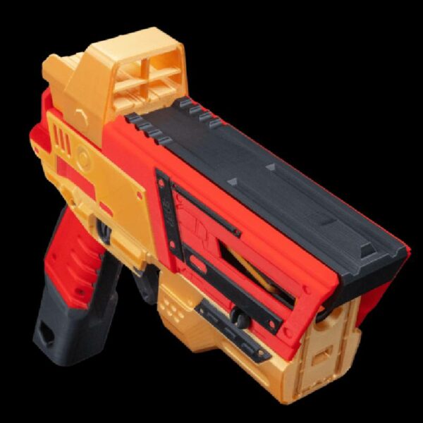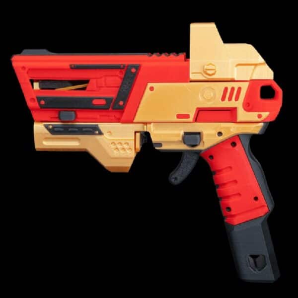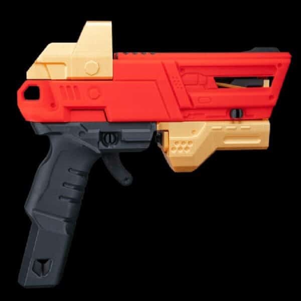 Lock on and line up the perfect shot with this precision-ready blaster. Aim true, fire fast, and claim victory. WARNING: This model has a rubber band–powered mechanism, therefore its shooting strength is different from NERF blasters.